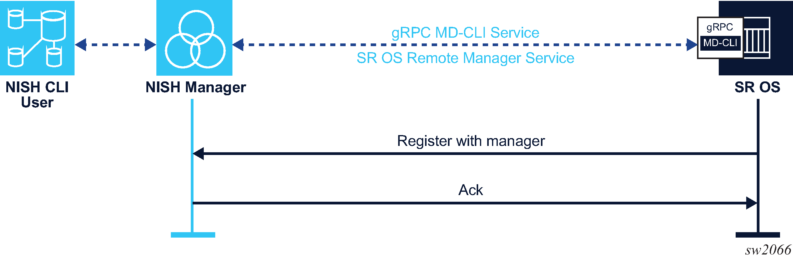 SR OS nodes register with the NISH manager when configured to do so through the SR OS remote management feature. The following figure shows the SR OS remote management communication with the NISH manager.
