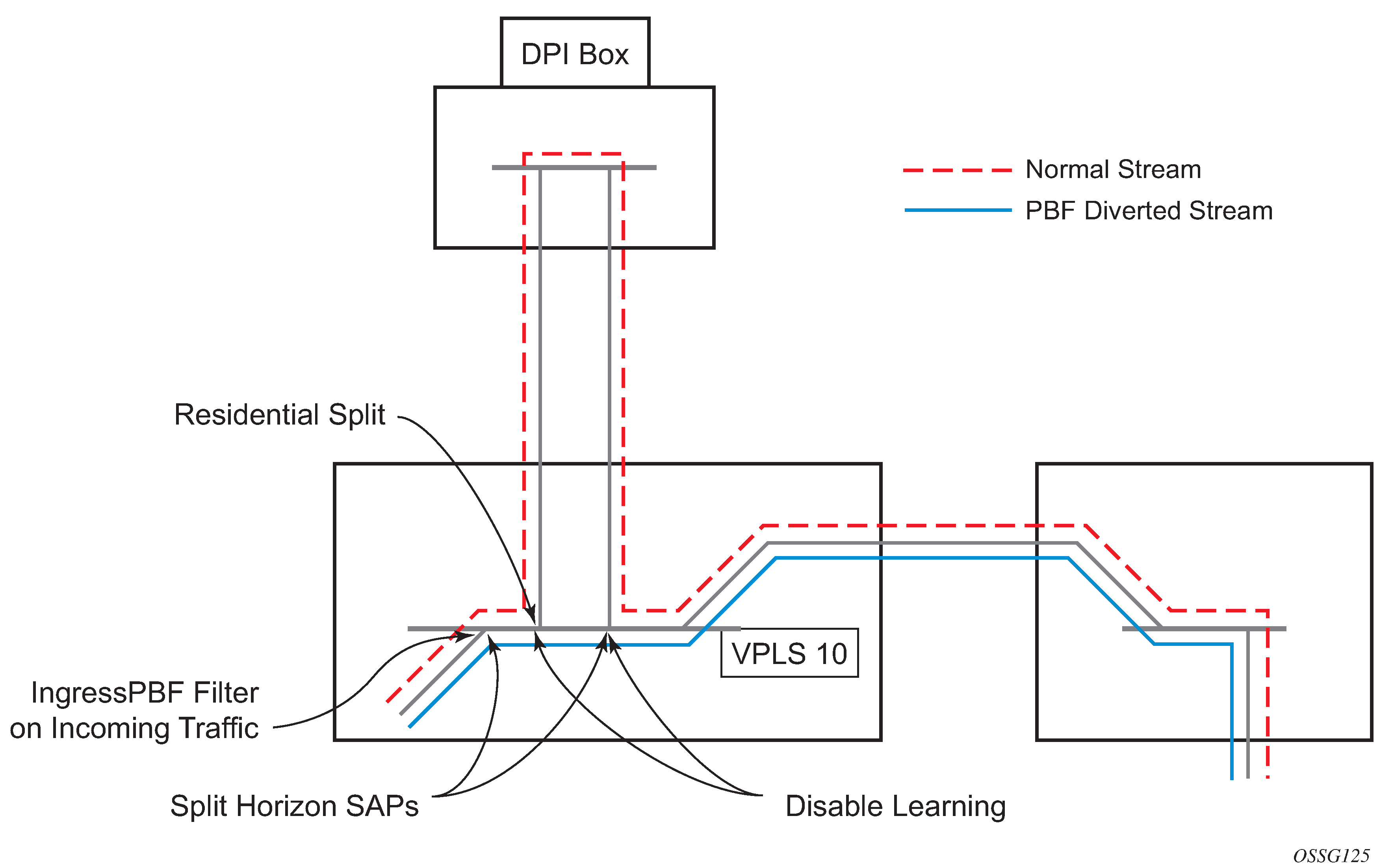 Figure: Policy-based forwarding for deep packet inspection shows an example to configure policy-based forwarding for deep packet inspection on a VPLS service. For information about configuring services, see the 7450 ESS, 7750 SR, 7950 XRS, and VSR Layer 2 Services and EVPN Guide.