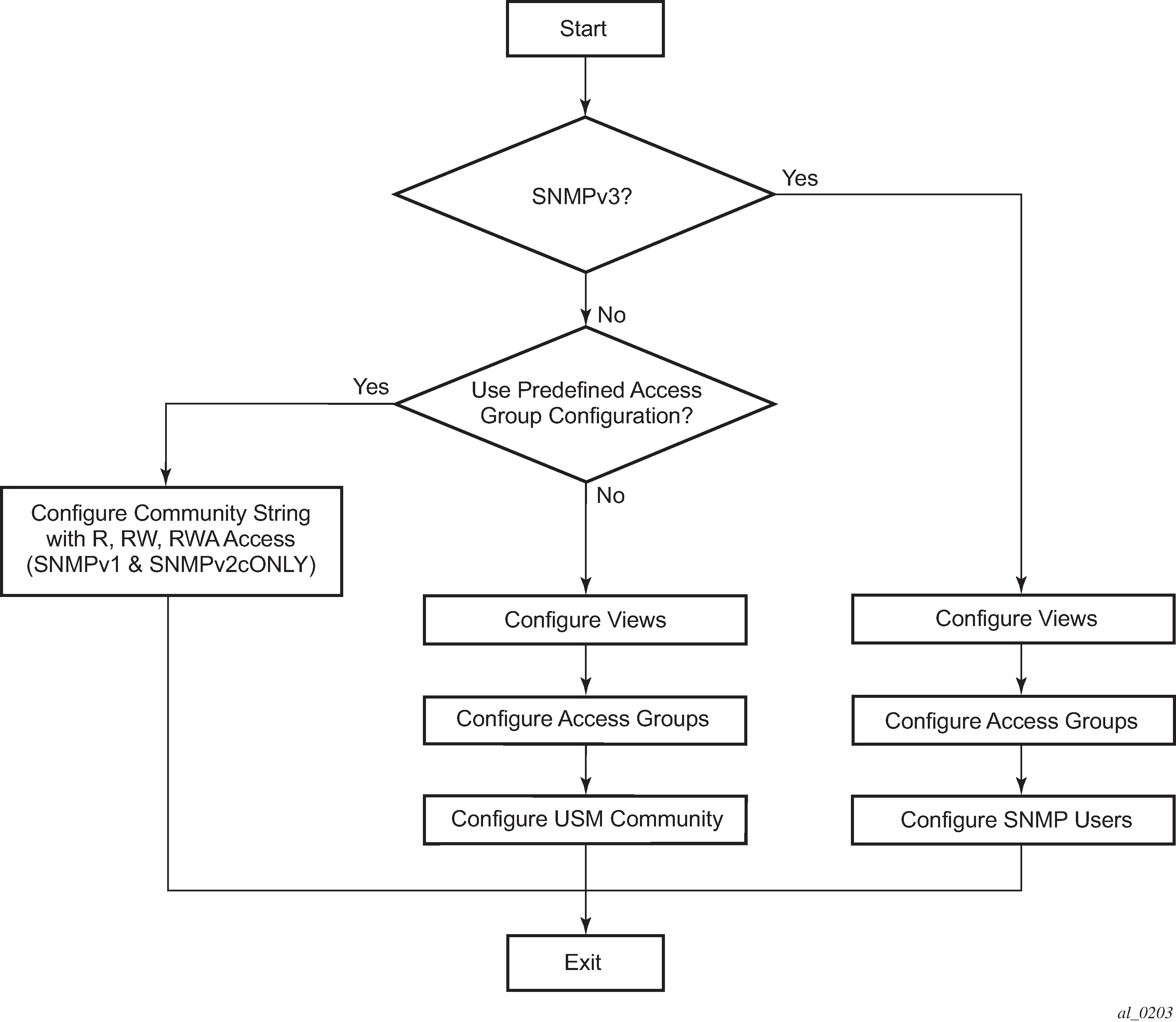 Figure: SNMPv1 and SNMPv2c configuration and implementation flow depicts the configuration requirements to implement SNMPv1/SNMPv2c and SNMPv3.