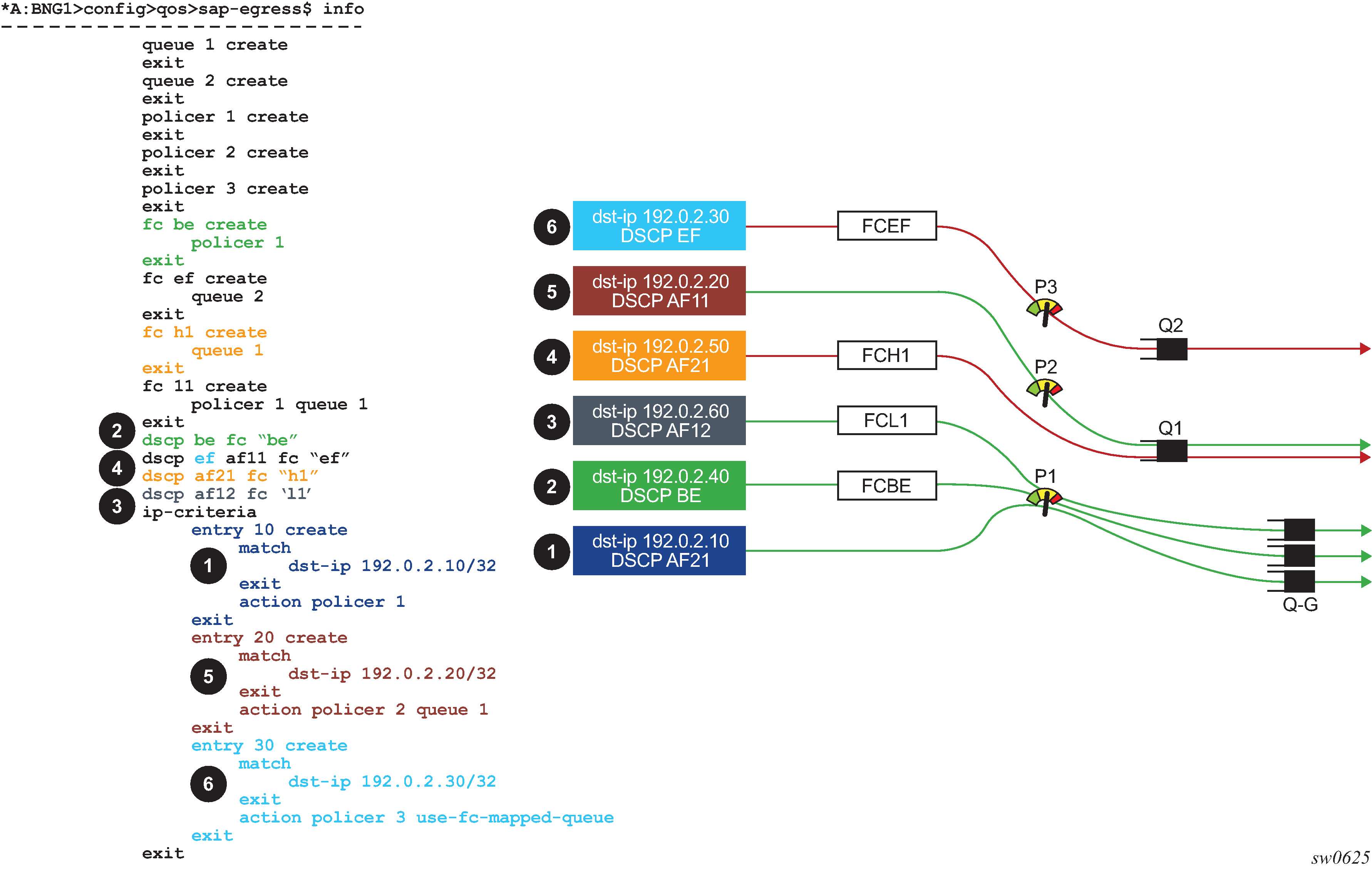 The grey traffic stream (box 3) is not classified by IP criteria (dst-ip 192.0.2.60 is outside any configured entry in the ip-criteria). Instead, this traffic is classified using DSCP=AF12 which is mapped to FC ‛l1’ and then to policer 1 followed by a local queue 1. In this case, only policer statistics are counted toward aggregated statistics. This is expected for accurate accounting (no double accounting).