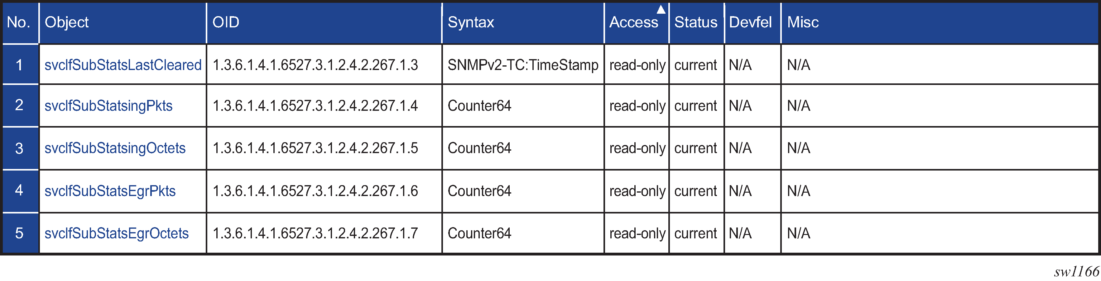 The MIB table name for the aggregated statistics under the subscriber and group interface is svcIfSubStatsTable and is described in Table: svcIfSubStatsTable objects .