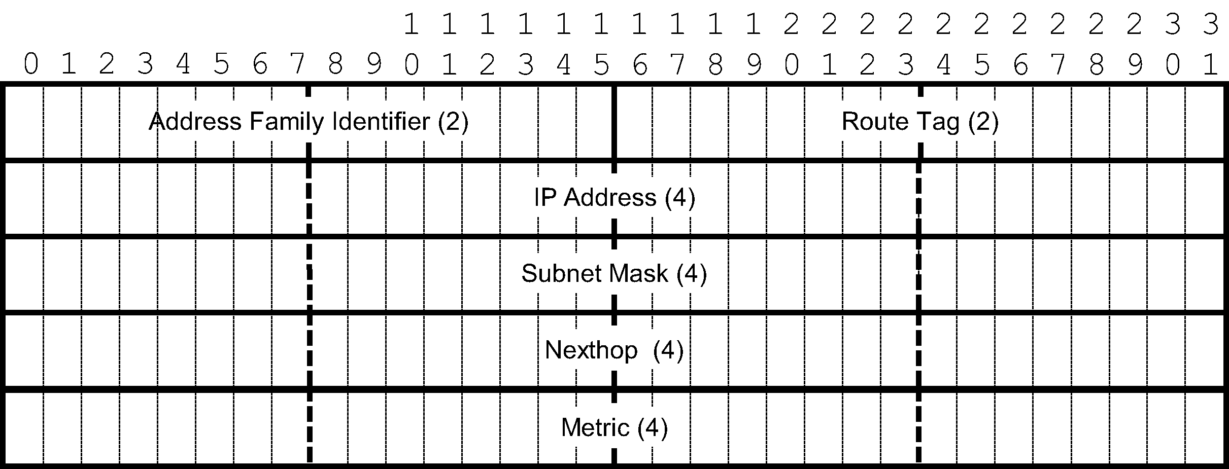 The RIP packet format is displayed in Figure: RIPv2 packet format.